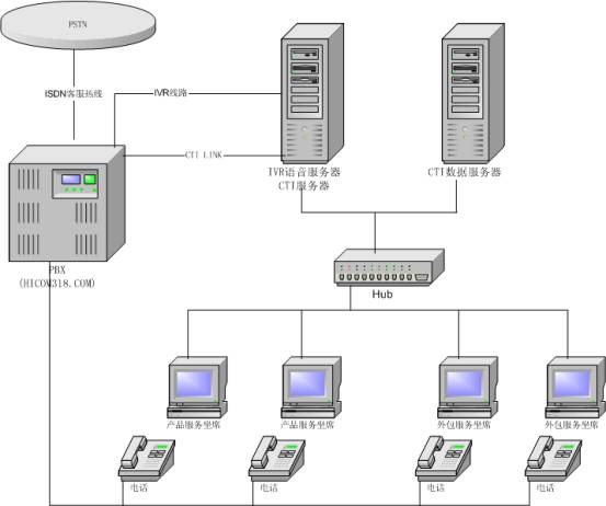 Siemens Hicom318.com交換機:接入ISDN中繼線,設(shè)置人工座席分機,為CTI,IVR語音服務(wù)器提供16路IVR端口和CTI