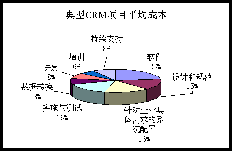 在企業(yè)確定了符合需求的CRM解決方案,包括軟件、供應商以及技術性能之后,仍然有很多其他因素值得考慮。最主要的因素之一即成本。典型的項目的預算成本中軟件成本占1/3,咨詢、實施和培訓成本占2/3。如下圖所示: