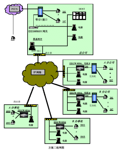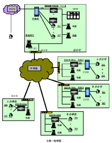 。。本方案有主要配置:總公司配備1臺EEGW8601E1網關、四個分公司分別配備1臺EEGW8504FXO網關,四個辦事處分別配備1臺EEGW8204FXO網關。在總公司出可以安裝EEGK8001簡易網閘。