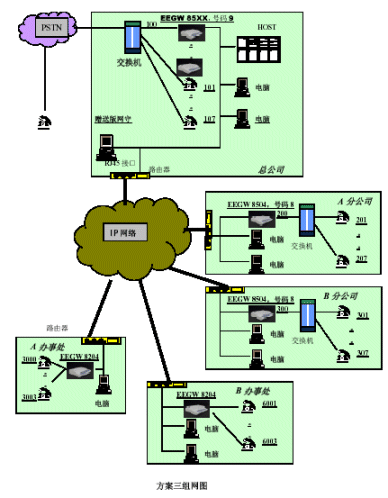 。。本方案有主要配置:總公司配備3臺EEGW8504FXO網關、四個分公司分別配備1臺EEGW8504FXO網關,四個辦事處分別配備1臺EEGW8204FXO網關。在總公司出可以安裝EEGK8001簡易網閘。