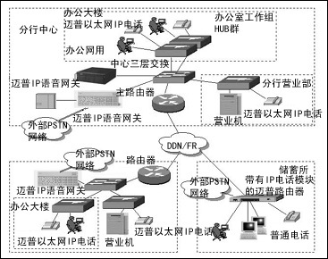 分行中心與下面的支行以及各儲蓄網(wǎng)點根據(jù)業(yè)務(wù)應(yīng)用需求出發(fā),可以利用邁普各系列路由器產(chǎn)品,通過DDN或者幀中繼把分行辦公大樓和營業(yè)部、支行辦公大樓和營業(yè)部、分行和支行下屬儲蓄所連起來。對于分行中心以及下面的支行,由于網(wǎng)絡(luò)結(jié)構(gòu)比較復(fù)雜,再加上網(wǎng)絡(luò)基礎(chǔ)設(shè)施建設(shè)已經(jīng)很完善,一般可以采用邁普IP語音網(wǎng)關(guān),通過它與原有的外部PSTN網(wǎng)絡(luò)相連。而對于一些較小的儲蓄網(wǎng)點,則可以通過采用帶有IP電話模塊的邁普路由器。邁普路由器的IP電話模塊可與電話機(jī)或交換機(jī)相連,能夠支持G.711、G.723、G.729等多種語音壓縮算法,并且還支持H.323協(xié)議,實現(xiàn)IP電話功能。