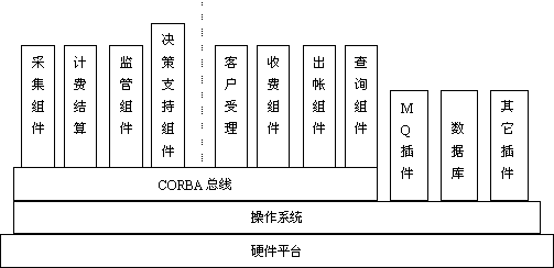 長(zhǎng)途電話聯(lián)機(jī)計(jì)費(fèi)系統(tǒng) 長(zhǎng)話計(jì)費(fèi)系統(tǒng)既包括計(jì)費(fèi)結(jié)算系統(tǒng),又包括營(yíng)業(yè)服務(wù)系統(tǒng),功能比較多,數(shù)據(jù)處理流程也相對(duì)復(fù)雜。 簡(jiǎn)單的傳統(tǒng)數(shù)據(jù)庫(kù)的機(jī)械化編程已很難滿足系統(tǒng)對(duì)大數(shù)據(jù)量的處理及靈活性等方面的要求,因此在這套系統(tǒng)中,我們采用了一些當(dāng)今業(yè)界的熱門(mén)技術(shù)。比如采用了CORBA軟總線思想和MQ Series消息管理隊(duì)列,也使之成為聯(lián)機(jī)計(jì)費(fèi)系統(tǒng)平臺(tái)的一次成功實(shí)施。其系統(tǒng)層次結(jié)構(gòu)圖如下: