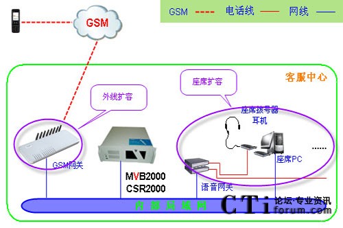 呼叫中心用于30路GSM網(wǎng)絡(luò)接入、20個座席人員使用,要求以后可擴(kuò)展到50座席人員或者更多。
