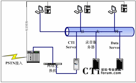 消費者撥打訂購電話,經(jīng)PSTN接入到呼叫中心交換機,由CTI服務(wù)器(CTI Server)通過交換機將話務(wù)分配到相應(yīng)空閑坐席。坐席端記錄訂購信息及消費者信息,并將信息存入數(shù)據(jù)服務(wù)器(DataServer)。交換機對通話進行全程錄音,并存入錄音服務(wù)器。同時可把進入系統(tǒng),但未排隊到坐席的話務(wù)數(shù)據(jù)記錄存入數(shù)據(jù)庫服務(wù)器,以便回訪。