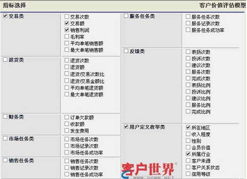 TurboCRM在長期支持CRM應用實踐過程中,總結(jié)出一套完整實用的客戶價值評估模型,評估指標包括交易類、財務類、服務類、反饋類、枚舉類、自定義指標等(如圖),結(jié)合不同的指標可以幫助企業(yè)評估客戶價值。