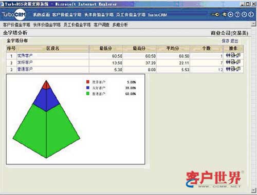 根據(jù)預先設定的客戶價值評估模型,CRM會自動計算出每個客戶的價值得分以及對應到不同等級的客戶價值,并會記錄到客戶項下,便于業(yè)務人員在與客戶接觸時,直觀了解客戶價值情況。客戶價值金字塔分析(如圖),可以動態(tài)的了解各類客戶的價值分布。