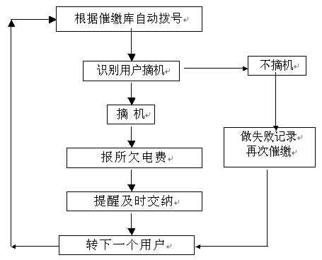 。。催費(fèi)工作是由指定的欠費(fèi)數(shù)據(jù)文件(或欠費(fèi)數(shù)據(jù)庫(kù))中提取用戶(hù)電話(huà)號(hào)碼和欠費(fèi)金額,自動(dòng)順序向各欠費(fèi)用戶(hù)撥號(hào),撥通后自動(dòng)播放催費(fèi)通知并通報(bào)欠費(fèi)金額數(shù)。系統(tǒng)自動(dòng)統(tǒng)計(jì)通話(huà)結(jié)果,系統(tǒng)對(duì)未應(yīng)答用戶(hù)會(huì)自動(dòng)重復(fù)多次撥叫。