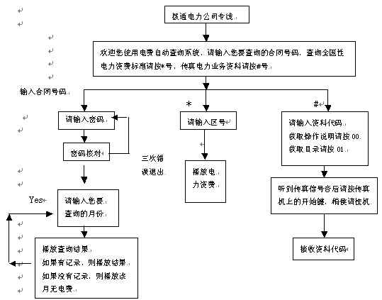 。。當(dāng)用戶(hù)得知需要繳納電費(fèi)時(shí),可撥打電力公司查詢(xún)熱線(xiàn),聽(tīng)到問(wèn)候語(yǔ)后輸入合同號(hào)碼,系統(tǒng)即可自動(dòng)播放用戶(hù)查詢(xún)?cè)路莸碾娰M(fèi)發(fā)生情況。