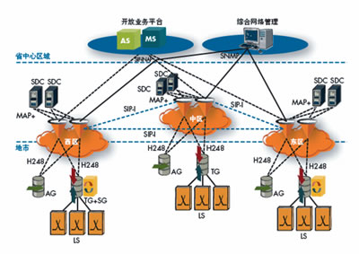 呼叫控制和信令層:三對軟交換被放置于省內(nèi)的三個區(qū)域,為網(wǎng)絡(luò)上的700多萬用戶提供呼叫控制和信令交換。這三個分離的區(qū)域提供省內(nèi)范圍的話務(wù)以及容災(zāi)備份。雙歸屬機(jī)制被引入從而能夠在集中式的網(wǎng)絡(luò)拓?fù)渲斜U习踩透呖煽啃浴?br />
