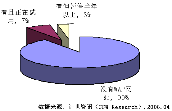2008年3月至4月,計世資訊(CCW Research)就企業(yè)WAP網(wǎng)站建設(shè)情況對北京71家企業(yè)進(jìn)行調(diào)研,這些企業(yè)大多分布在互聯(lián)網(wǎng)、IT、電信等行業(yè)。從調(diào)研結(jié)果來看,企業(yè)WAP應(yīng)用還處于初級階段,71家企業(yè)中只有7家擁有自己的WAP網(wǎng)站,其中有兩家企業(yè)的WAP網(wǎng)站已經(jīng)暫停使用超過了半年。接受訪談的71家企業(yè)無一例外的都有自己的WEB網(wǎng)站,與企業(yè)WEB網(wǎng)站相比,企業(yè)WAP網(wǎng)站普及程度還很低。