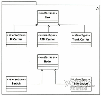 該擴(kuò)展針對(duì)Link和Node和兩個(gè)元類增加了NGN中關(guān)于承載和節(jié)點(diǎn)的定型?梢愿鶕(jù)需要對(duì)該模型作進(jìn)一步擴(kuò)展,如可以增加關(guān)于接入網(wǎng)承載的定型等。