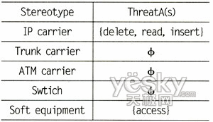 針對(duì)圖1中定義的定型以及對(duì)網(wǎng)絡(luò)安全構(gòu)成威脅的攻擊者的類型,可以定義出威脅函數(shù)TheatA(s)。其中A表示攻擊者類型,這里假定攻擊者為具備一般能力的外部攻擊者,即其可以竊聽(tīng)到廣播信道上的數(shù)據(jù)流量,并可以插入或刪除數(shù)據(jù)流量,能夠利用系統(tǒng)漏洞入侵系統(tǒng);表示為模型中定義的定型威脅函數(shù)的值域?yàn)閧delete,read,insert,access}。根據(jù)NGN中承載網(wǎng)絡(luò)和計(jì)算節(jié)點(diǎn)的特性,我們可以得出如下威脅函數(shù),如表1所示。