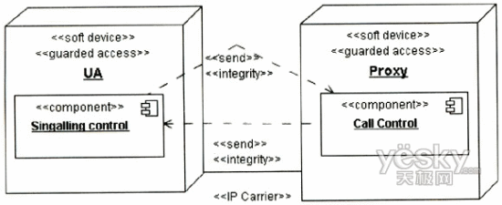 下面以基于SIP的兩方會(huì)話為例說(shuō)明如何使用UMLsec描述業(yè)務(wù)安全需求。假定兩方呼叫發(fā)生在同一SIPProxy轄域的兩個(gè)用戶之間,要求保證用戶UA與SIPProxy之間的信令的完整性,不能被非法入侵者篡改。該場(chǎng)景的用例圖和部署圖分別如圖2、圖3所示。