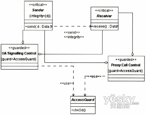 圖3中的UA代表UserA或UserB的UA,因?yàn)閮蓚(gè)UA的信令交互需要通過(guò)Proxy,且其安全需求是一致的,故在圖中只表現(xiàn)出一方。UA和Proxy均是基于通用計(jì)算平臺(tái)的節(jié)點(diǎn),其訪問(wèn)控制需要受到保護(hù),故對(duì)其標(biāo)記上定型《guardedaccess》。UA中除處理信令外,還需處理媒體流的編解碼與控制,這個(gè)用例中只涉及信令的安全性,故在UA中只關(guān)注進(jìn)行信令控制的組件。UA與Proxy之間的通信基于IP承載,根據(jù)表1定義的威脅函數(shù):ThreatA(IP