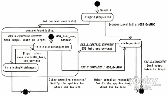 下面說(shuō)明如何利用GSS-API實(shí)現(xiàn)保證通信完整性的安全能力抽象類,通過(guò)狀態(tài)圖說(shuō)明保證通信完整性的Sender類的send()方法及Receiver類的receive()方法的GSS-API實(shí)現(xiàn)。本文中給出的是一個(gè)示意性的說(shuō)明,忽略了一些錯(cuò)誤處理過(guò)程。