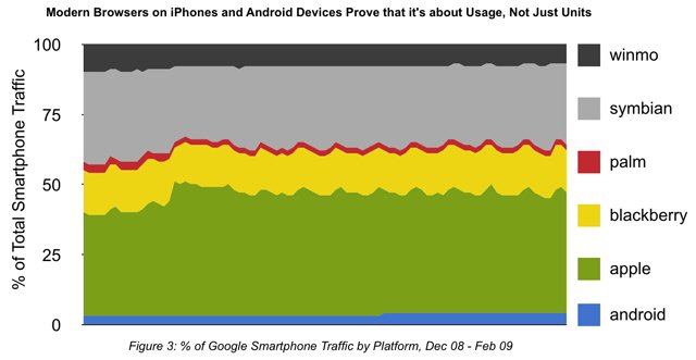 這里有個(gè)例子:iPhone、Android手機(jī)雖然僅占到智能手機(jī)市場(chǎng)份額的13%,卻貢獻(xiàn)了50%的智能手機(jī)Google搜索流量(Google訪問)。