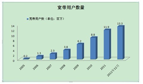 去年進(jìn)行的3G/BWA牌照拍賣有望成為一個催化劑,將寬帶接入擴(kuò)展到印度最偏遠(yuǎn)的地方。印度電信市場正在經(jīng)歷“信息革命”。為了促進(jìn)寬帶的普及,政府已經(jīng)公布并實(shí)施了多項政策(見方框3)。得益于這些政策的實(shí)施,寬帶用戶數(shù)從2005年的18萬增加到2011年3月的1187萬,2011年底達(dá)到1330萬。