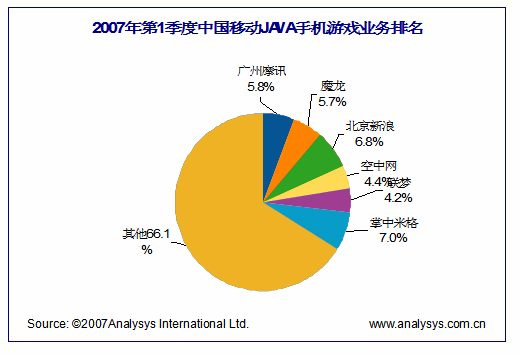 從企業(yè)實力和市場份額來看,目前手機游戲市場主要有三股力量組成,以空中等為代表的全業(yè)務線電信增值服務商(SP),以新浪等為代表的互聯(lián)網門戶綜合服務商,以米格、魔龍為代表的專業(yè)手機游戲產品與服務提供商(SP)。根據(jù)中國移動“百寶箱”第1季度收入數(shù)據(jù),易觀注意到,掌中米格、北京新浪、廣州摩訊位列前三,前三名占據(jù)了近20%的市場份額。夢網手機游戲精品業(yè)務的三家服務提供商第一季度收入排名為:米格、新浪、空中網!